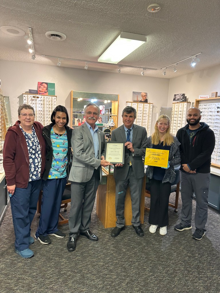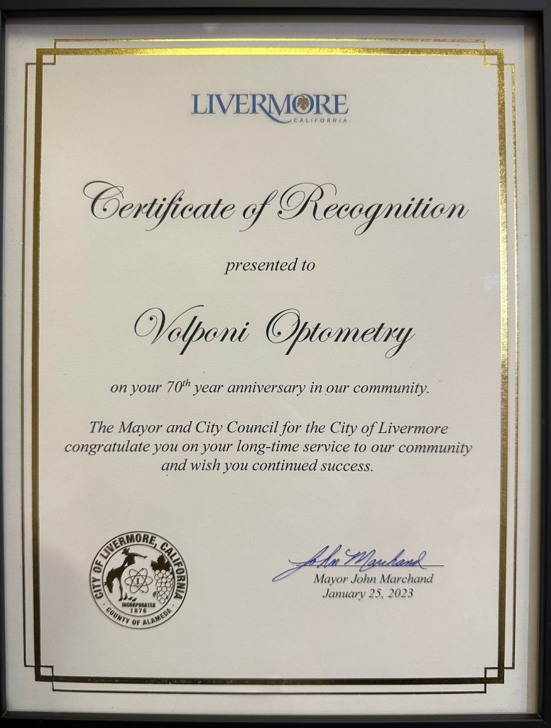 On January 25th, 2023, Livermore Mayor John Marchand awarded Dr. Jim Volponi and the staff of Tri Valley Optometry a Certificate of Recognition for 70 years of service to the community!